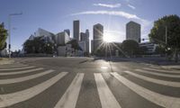 A metropolitan cityscape with modern architecture, open public spaces, and a winding road lined with automobiles in the sunshine. The clear sky has contrails above the endless urban property and the sun is visible in the horizon.