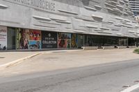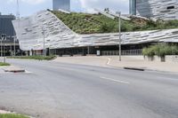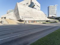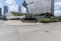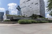A skyline of modern architecture, high-rises, and Brutalist design in the metropolitan area of Dallas, Texas. The downtown area is bustling with business, transport, infrastructure, and public space, with a residential area in the background. A clear sky and open space trees line the concrete street in the foreground.