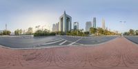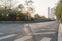 The skyline of the city of Guangzhou in China is a mix of modern architecture, residential areas, and public spaces. The roads are lined with trees and the road surface is made of asphalt. On this sunny day, a clear sky provides a stunning backdrop to the vibrant cityscape.