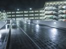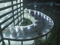 A view of the modern architecture of Los Angeles, California, USA, at night. Featuring the city skyline, roads, concrete, water, light, glass, an automotive exterior, curves, parking garages, wet surfaces, an urban table, parking lots, street lights, artificial light, parking decks, entries, exits, highway entrances, highway exits, highway ramps, inclines, on-ramps, slopes, Armco barriers, barriers, buildings, open spaces, trees, structures, high reflections, and a stadium.
