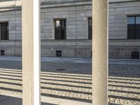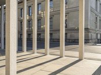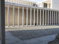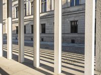 A view of a mixed-use property in Berlin, Germany featuring a blend of modern and classic architecture. The brick facade is highlighted by the clear sky and a beige sandstone wall. There are many structural elements evident, such as lines, columns, windows, and doors, as well as a cobble stone road, handrail, and a porch. The urban design of the neighborhood provides a sense of city life and real estate that is seen in many European business districts.