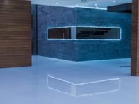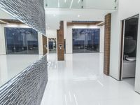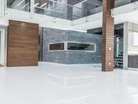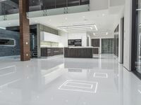 A view of the modern architecture of a Los Angeles home, featuring white marble tile flooring, glass windows, concrete surfaces, and a kitchen with cabinetry, countertops, and paver brick design. The interior design includes furniture, a handrail for the elevated stair, and a lobby with a high ceiling.