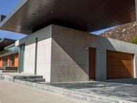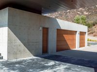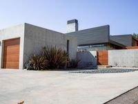 A modern villa with a concrete surface and parking garage is seen in a rural setting in Los Angeles, California, USA. A clear sky and open space stretch straight down the road.