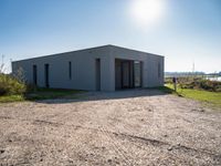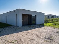 A modern villa in a residential area of Holland, Netherlands. The landscape consists of grass, trees, and other vegetation, along with asphalt roads and concrete sidewalks. A charging station is visible on the property, with a clear sky in the background.