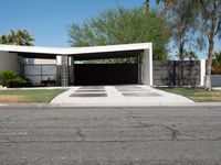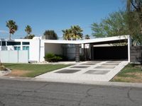 A low profile mid century modern home located in Palm Springs, California, USA is framed by a hedge, palm trees, and an asphalt driveway, leading straight down the road past the carport and parking garage.