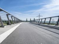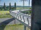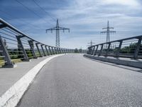 The modern architecture, infrastructure, and urban design of Germany can be seen in this landscape, featuring a road, bridge, overhead power lines, buildings, trees, vegetation, and more, against a clear sky and tar road surface.