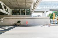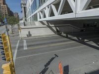 A view of a high downtown business district in Milwaukee, Wisconsin, USA. The scene features a combination of modern architecture, elevated roads, underpasses, trees, office buildings, and pedestrians all in one view. The urban design is made up of concrete, asphalt, and other materials, with a hard shadow cast from a cloud overhead.