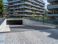 A cobblestone road leads to a residential area of modern architecture in a European city, with a clear sky above and a hard shadow below, showing the urban design of a city life in Germany.