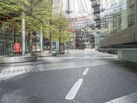 The cobblestone roads and modern architecture of Berlin, Germany make up the bustling metropolis and tourist attraction. Potsdamer Platz and the Sony Center are visible in the snapshot of the city life, with glass walls, store fronts, and asphalt thoroughfares. The urban design and infrastructure of the European town create an atmosphere of business, shopping, and transport.
