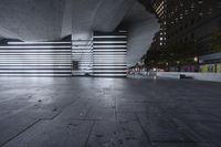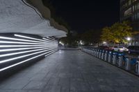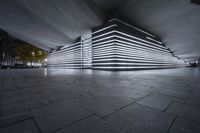 A monochromatic night shot of an elevated road, lined with modern architecture and skyscrapers, in the metropolitan area of Manhattan, New York, USA. Automobiles, white walls, and black asphalt create a unique atmosphere, highlighted by artificial light and motion blur reflections on the road surface.
