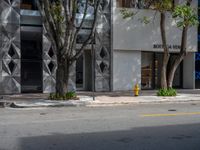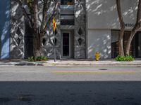 A view of the asphalt road of Miami Beach, Florida, USA, with a hard shadow created by the modern architecture and urban design of the city, and a storefront shop in the foreground.