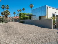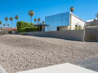 The residential villa in mid-century modern architecture sits elevated in the Sonora Desert of Palm Springs, California. Its driveway is made of asphalt and gravel with a grass surface, leading to a parking lot with a clear sky view of a mountain. The entry is framed by a hedge and palm trees, making it a modern oasis in the suburban USA.