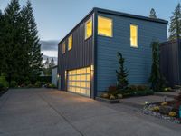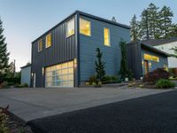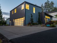 A stunning modern villa with a yellow facade and grey siding in a residential area of California. The clear sky at dawn illuminates the straight road surface and the beautiful vegetation surrounding the property.