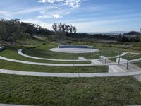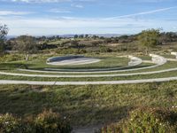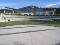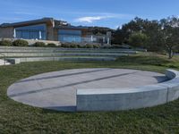A beautiful modern residential home in California, USA. The house is surrounded by a lush green lawn and features a stunning architecture design. The backyard courtyard offers an open space with a clear sky and a variety of trees and shrubs. The concrete surface adds a contemporary touch to the property, while the elevated sculpture in the foreground adds an artistic element. The landscape includes a mountain in the distance, creating a picturesque view. This property is a perfect example of modern architecture in a suburban setting.
