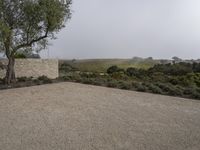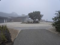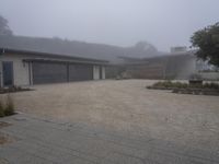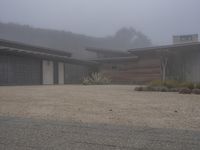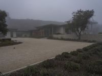A beautiful modern residential property in Los Angeles, California, USA. This house features stunning architecture and is surrounded by lush green grass and trees. The spacious open space and courtyard provide a peaceful retreat in the bustling city. The grey sky and fog create a gloomy yet serene atmosphere. The property also includes a driveway, garden, and parking garage.