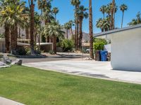 A clear day in Palm Springs, California, USA showcases the mid century modern architecture, surrounded by the Sonora Desert and featuring a grass surface and paver concrete pathway leading to a residential building with palm trees.