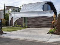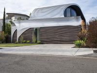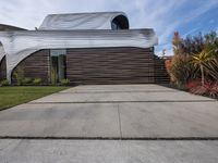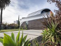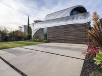 A modern residential building in Los Angeles, California, USA. The architecture features a low, concrete facade with straight roads leading to the property. The house has a futuristic design with a grey sky in the background.