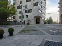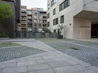 The modern architecture of Hamburg, Germany is featured in this image. With mixed-use buildings, houses, and cobble stone roads, the residential area of HafenCity is a popular urban and public space. Real estate, trees, and grass create a distinct urban design, with concrete, tile, and paver flooring, walls, and curbs surrounding the area.