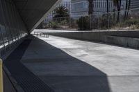 A black automobile is parked on a modern roadway in the metropolitan area of Los Angeles, California, USA. The concrete walkway with a fixed link is framed by modern architecture, buildings, walls, and infrastructure. The structure is surrounded by a parking lot and open space, with a roof, asphalt road surface, and clouds in the sky above.