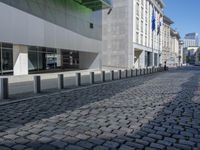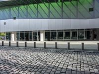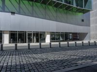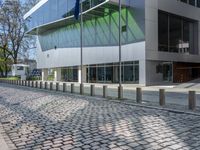 A view of the modern urban architecture of Berlin, Germany, featuring buildings, homes, office buildings, public spaces, curbs, cobble stones, wall, infrastructure, roofs, estates, fences, transport, urban design, profiles, arenas, stadiums, vehicles, metals, residential areas, road surfaces, lanes, human settlements, concrete, floors, floorings, glasses, walkways, modes of transport, parking lots, and more.