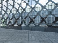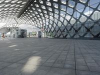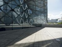 A view of the modern architecture, buildings, and open spaces of Shenzhen, China, from a walkway. The skyline is composed of concrete, glass, and metal structures that reflect the wet asphalt of the road surface. Iron fences, walls, and archways provide a symmetrical urban design, while the trees and condominiums of the residential area provide a contrast to the futuristic architecture of the corporate headquarters.