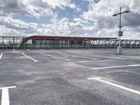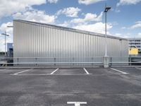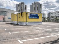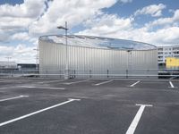 A view from the top of a parking deck shows the modern architecture and open space of urban Berlin, Germany, with a clear sky and concrete street stretching straight down the road.