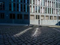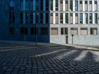 The hard shadow of an office building in the financial district of Berlin, Germany, casts over the cobblestone surface of the city on a clear day. The open space provides an ideal setting for modern urban design in the heart of Europe.