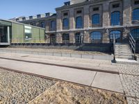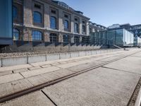 A view of the modern architecture of Berlin, Germany, featuring a residential area with classic architecture and industrial warehouses, a cobble stone walkway, a clear sky with contrails, and a road surface with a track for public transport. This cityscape is a reflection of the diverse urban landscape of this European metropolis.