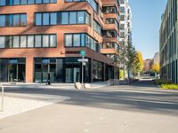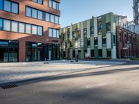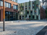 On a clear day in Berlin, Germany, a cobble stone road is surrounded by modern architecture and open spaces, with clouds and contrails silhouetted against the shadow of a city skyline.