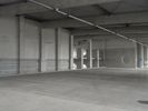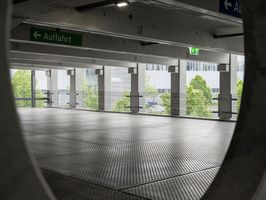 A straight road lined with modern architecture and urban design in Berlin, Germany leads up to an elevated parking deck with a view of a cloudy foreground.