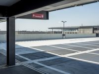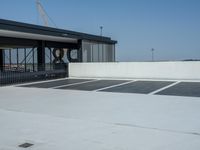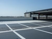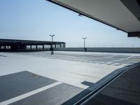 A picture of modern architecture, infrastructure, and public space of Berlin, Germany. Featuring a modern building, clear sky, concrete surface, window, line, asphalt, parking garage, parking lot, transport, stadium, airport, race track, road surface, lane, light, street light, crosswalk, floor, roof, cloud, curb, highway, house, design, property, tree, and metal.