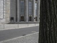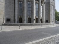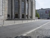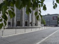 The facade of the classic architecture building in the foreground of the urban landscape of the residential area, with the asphalt road lined with trees and the looming shadow of the tall Brutalist columns in the Volksbühne neighborhood of the town, is a testament to the beauty of city life and its infrastructure.