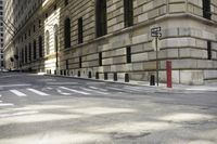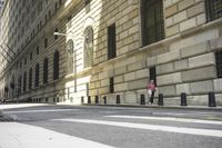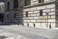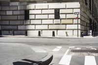 A low angle shot of a monochrome road in the city of Manhattan, New York, USA. The iconic brick and arched facade of the classic architecture office building is illuminated by the sun, casting a long shadow of the column and archways. The black and white snapshot reveals a symmetrical pattern of the urban infrastructure, including the elevated crosswalk, zebra crossing, tree, and curb.