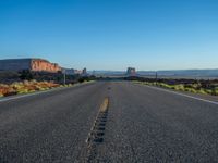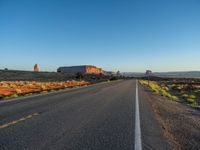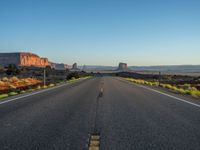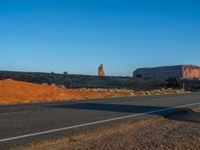 In the heart of the USA, between Arizona and Utah, lies the iconic Monument Valley landscape. The straight road cuts through the vast desert, casting long shadows at dawn. The clear sky above frames the hard shadows on the asphalt, creating a picturesque scene of nature's beauty. As the sun rises, the landscape comes alive with one quarter of the day still ahead, inviting travelers to explore the breathtaking views.