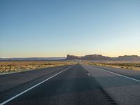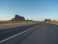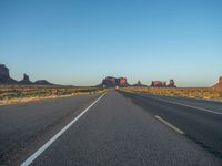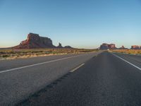 In the heart of the USA, near the Arizona-Utah border, lies the iconic Monument Valley. As the dawn breaks, a straight road cuts through the vast desert landscape under a clear sky. The asphalt road stretches for miles, offering a unique perspective of the natural beauty that surrounds it. This one-quarter stretch of road embodies the untouched nature and grandeur of the American Southwest.
