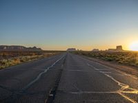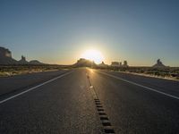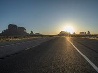In the heart of the American Southwest, Arizona's Monument Valley offers a stunning landscape at dawn. The straight road stretches into the distance, flanked by the iconic red rock formations under a clear sky. The sun rises, casting a golden glow over the asphalt as nature awakens to a new day. With the sun visible on the horizon, the scenery is bathed in sunshine, creating a picturesque view of this natural wonder.
