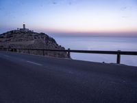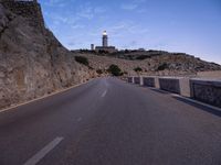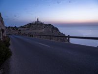 The moonlight illuminates the dark asphalt road as it curves along the coastline of the Balearic Islands in Europe, with an Armco barrier and lighthouse in the distance. Located in Spain, Mallorca is a beautiful spot to experience the wonders of nature, even at night.