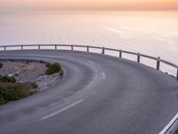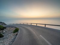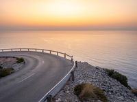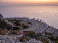A dark, coastal stretch of road illuminated by moonlight stretches straight down the road, with an Armco barrier elevated on a high curve in Mallorca, Balearic Islands, Spain, Europe. The low light of dawn reveals a tranquil nature landscape, with an ocean and a lighthouse in the distance.