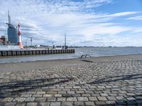 The coastal city of Bremen, Germany is a vibrant urban area with cobble stone roads, tree-lined avenues, and a variety of architecture. An early morning view of the Bremerhafen pier reveals the clear sky and azure lake, with the flag flying in the wind above a lighthouse and wooden jetty. A calm atmosphere is created from the sunlight and water resources, providing a perfect spot for outdoor furniture and a peaceful break from the city life.