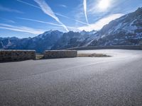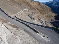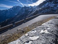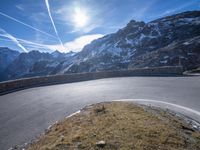 A road winding its way through the snow-capped mountain terrain of the Stelvio Pass in South Tyrol, Italy. The beige Armco barrier stands against the backdrop of the alps, with a low horizon, lake reflections, and a vivid blue sky dotted with contrails.