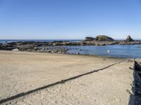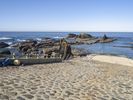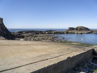 A close-up of an automotive tire on the asphalt of a highway entrance in Portugal. The elevated entry gives a bird's-eye view of the beige gravel and cobblestone bedrocks, brick and brickwork, and concrete curbs that make up the coastal landscape. The clear sky and azure watercourse below create a calm atmosphere, while the sunlight and wave formation create a natural pattern. Trees and vegetation can be seen in the background beneath the mountain highlands.