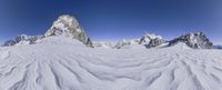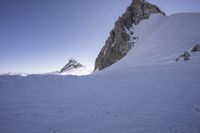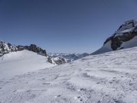A sweeping view of the snow-covered mountain range in the Italian Alps, featuring a nunatak, glacial slopes, and cliff faces, with a clear sky and contrails in the background. A popular tourist attraction in Europe, the Alps are ideal for skiing and offer spectacular overlooks and summits to explore.