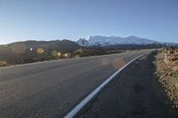 Scenic view of a mountain landscape with lush vegetation and plant community, as seen from an elevated road. The road surface, made of asphalt, curves through the rural countryside, lined with Armco barriers and guard rails for safety. The day is clear with fluffy clouds in the sky, and the view overlooks the high hills and snowy peaks in the distance. The brown trees and tar on the road add a touch of natural beauty to the overall picturesque scenery. This is a breathtaking view of the mountain landforms, highlighting the highlands and infrastructure that blend seamlessly with the horizon and sloping plain below.