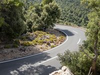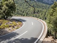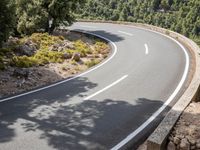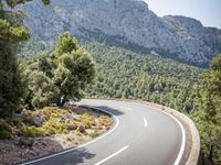 A winding two-lane highway curves through a mountainous landscape in the Balearic Islands of Spain. The road is surrounded by vegetation, rocky terrain, and a guard rail. This mode of transport provides access to the local wilderness, making it a popular spot for recreational activities like walking, cycling, and driving.
