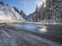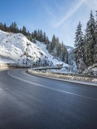 A low Armco barrier on a winding highway in the German and Swiss Alps during a winter morning. The sunny day reveals a frosty mountain landscape with evergreen trees, snow, and ice on the road surface.