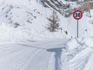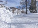A winding piste through the glacial Moraine of the German Alps, surrounded by high arêtes, trees, and frost-covered wilderness in the early hours of dawn. The sun is starting to peek through the clouds, bringing a hint of sunshine to a freezing winter day.