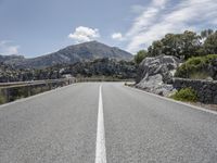 A scenic view of a mountain range in Mallorca, Spain with a road winding through the landscape. The sun is shining brightly on the clear day, revealing the varied features of the Armco barrier, road surface, trees, cliffs, vegetation, and infrastructure in the foreground. The mountain range creates an impressive backdrop to the panoramic view.