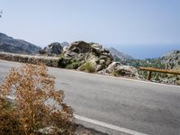 A highway winds through a mountain pass with the coastline of the Balearic Islands in the distance. The view from the elevated road is clear and the lush vegetation and Armco barrier provide a sense of safety and security. The infrastructure of Europe is on full display in this stunning landscape.