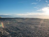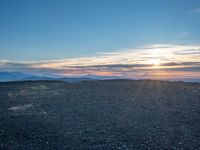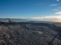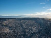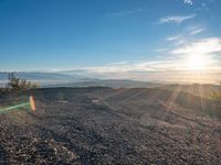 A stunning view of Los Angeles, USA, captured at dawn from Mulholland Drive. The rugged dirt road curves through the open space, passing through rural landscape, sand, and gravel to reach an overlook of the city skyline. The sky is dark, but the sun shines on the surface of the track, creating an emotional scene of nature and recreation.