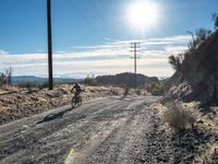 A bike rider takes in the sunny, rugged landscape of Mulholland Drive in Los Angeles, California, USA. The open space and steep surface of the dirt road provides an emotional overlook of the cityscape and clear sky with contrails. A perfect day for recreational off-roading.